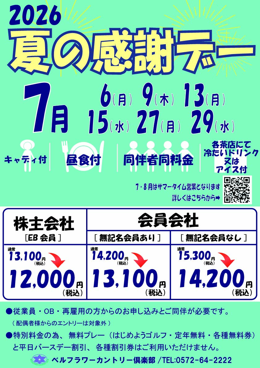 お得なイベントです!!各茶店にて冷たいドリンクまたはアイス付き♪ご同伴者様も嬉しい同料金です。従業員・OB・再雇用の方からのお申込みとご同伴が必要です。(配偶者様からのエントリーは対象外)特別料金のため、無料券(はじめようゴルフ・定年無料・各種無料券)、平日バースデー割引き・各種割引券はご利用いただけません。ぜひ、ご予約お待ちしております。