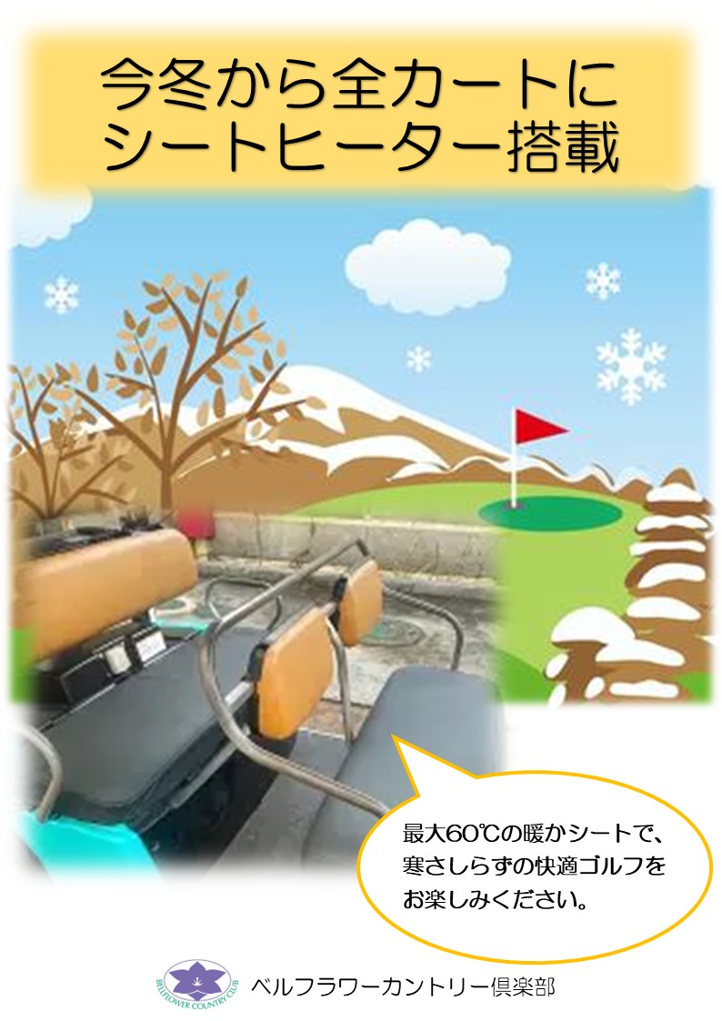 今冬より全カートにシートヒーターを搭載します。最大60℃の暖かシートで寒さしらずの快適ゴルフをお楽しみください。1月下旬から順次ご利用いただき予定です。