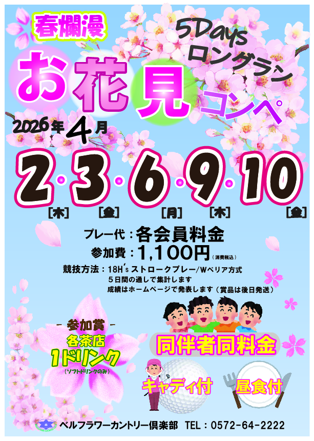 5日間のロングランコンペ♪参加賞は各茶店1ソフトドリンク♪賞品はベルフラワー割引き券♪(後日発送)ご同伴者様も嬉しい同料金♪ぜひ、ご予約をお待ちしております。