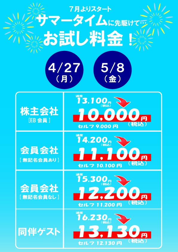 7月・8月のサマータイム営業に向けてお試しプレーをしてみませんか?プレサマータイム特別料金のご案内です!スタート時間:トップ7:00~9:20全組スループレー!(キャディ付・昼食付)※キャディが足りない場合はセルフをお願いする場合がございます。 セルフをお選びすることはできません。ぜひ、ご予約をお待ちしております。
